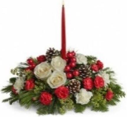 Round Christmas Centerpiece. Your choice of candles of no candles. Flowers may vary