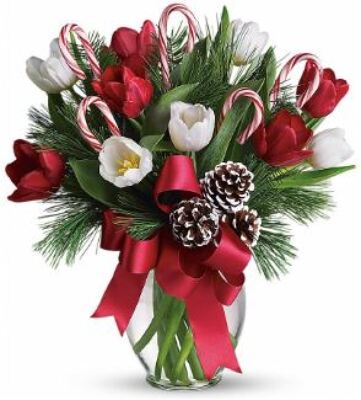 Nothing's sweeter than Christmas tulips - except maybe Christmas tulips with candy canes! This jolly arrangement is about as fun and festive as they come, mixing fresh red and white tulips with fragrant Douglas fir and white pine. Say Merry Christmas to a teacher, friend or loved one far away.